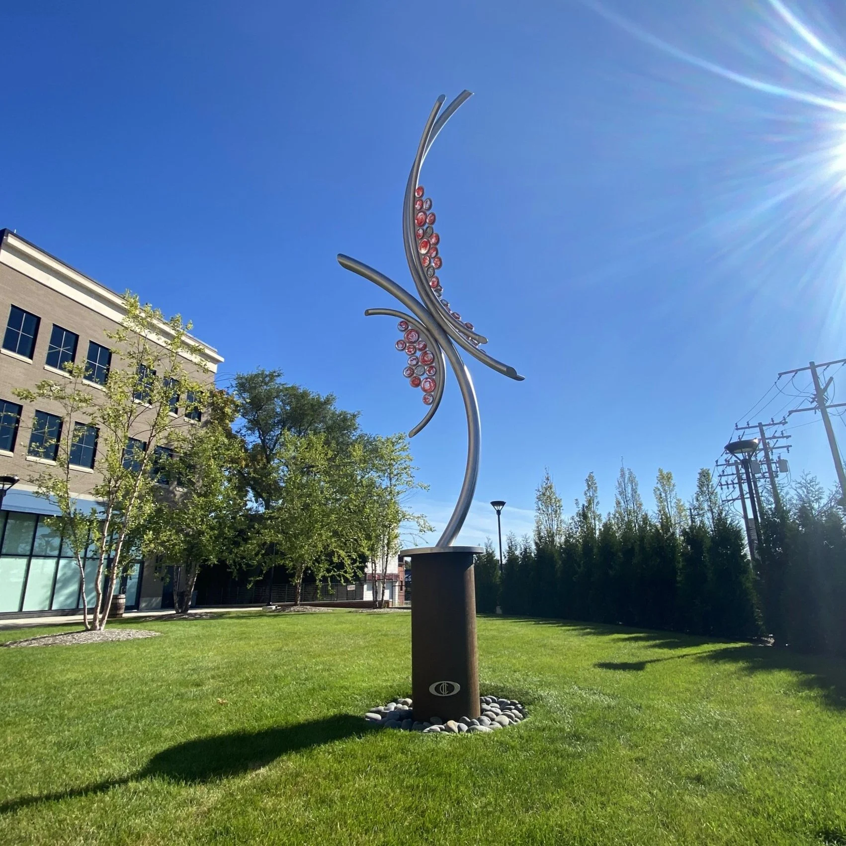 Symbolizing the growth of the three Nordin Brothers, this sculpture is 20 ft tall and is made of steel and glass.